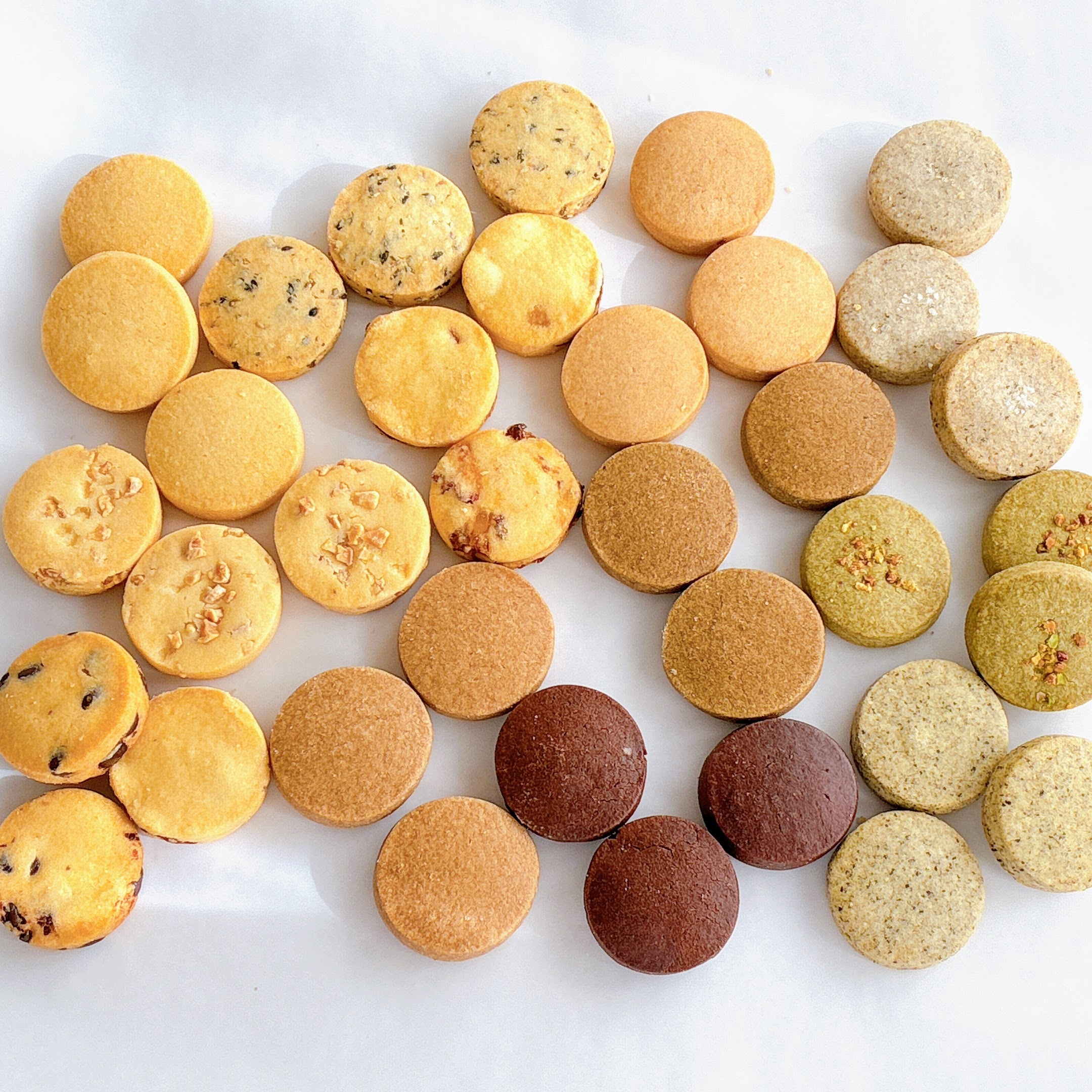小麦粉(国内製造)、バター、砂糖、卵黄(卵含む)、コーンスターチ、アーモンドパウダー、※ドライフルーツ、チョコチップ(砂糖、植物油脂、ココアパウダー、カカオマス / 乳化剤(大豆レシチン)、香料(バニリン))、アーモンドダイス、ココア豆、ごま、塩、抹茶、紅茶(アールグレイ茶)、紅茶(セイロン)、シナモン、コーヒー豆、ほうじ茶、ピスタチオ